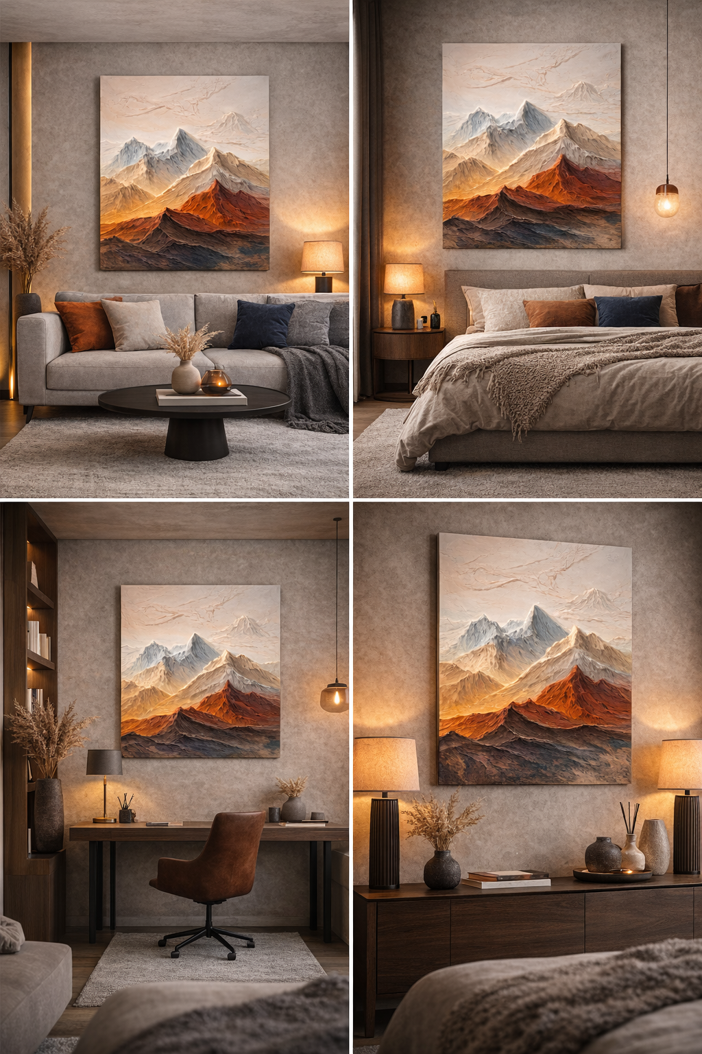 This minimalist landscape design works beautifully in modern interiors, Scandinavian homes, Japandi-style spaces, and contemporary living rooms. The calm neutral palette allows it to integrate seamlessly with different decor styles while adding a striking artistic focal point.