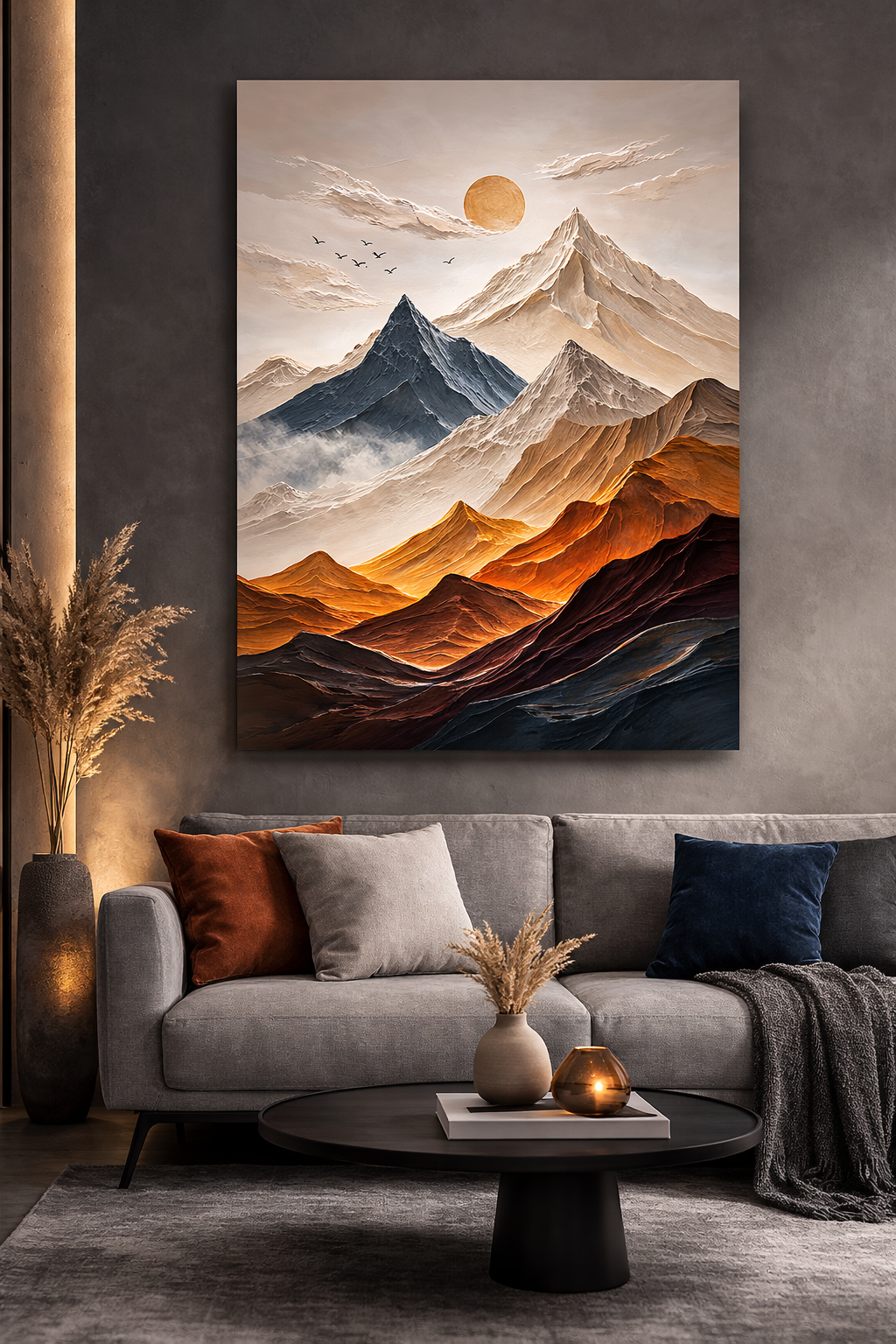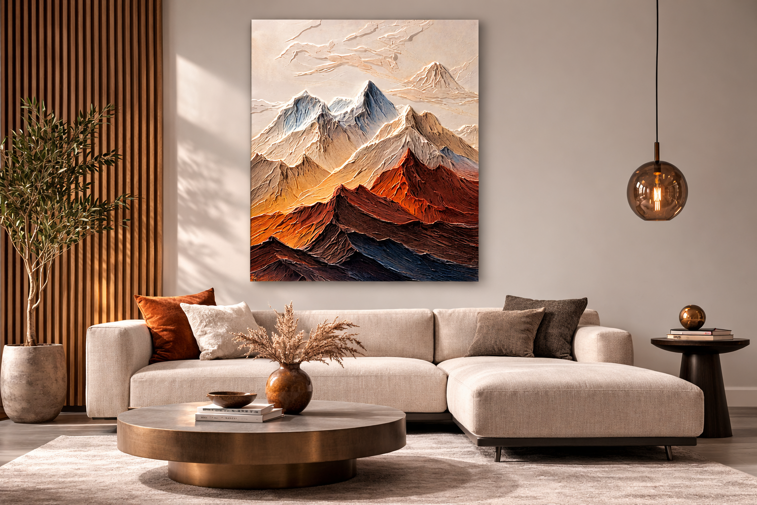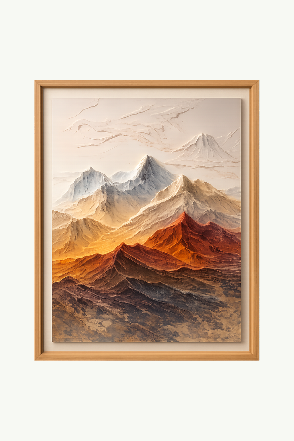 Bring the beauty of nature and modern artistic texture into your space with this modern mountain landscape digital wall art. This artwork features layered mountain peaks designed with a sculptural, textured style that creates a sense of depth and movement. The composition blends warm earthy tones, burnt orange, deep rust, soft beige, and cool slate blue, giving the artwork a sophisticated and contemporary appearance.