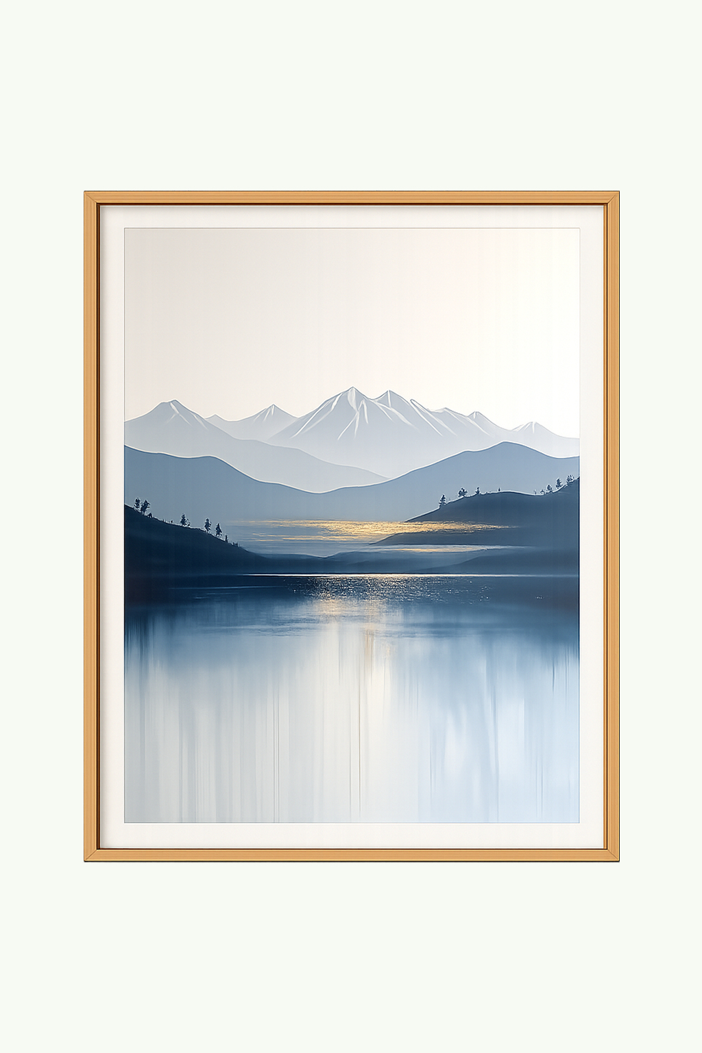 Serene Mountain Reflection is a contemporary landscape artwork inspired by layered mountain silhouettes and tranquil water reflections. The soft blue-grey palette combined with subtle golden accents creates a balanced and calming presence — ideal for modern homes, studios, and offices.